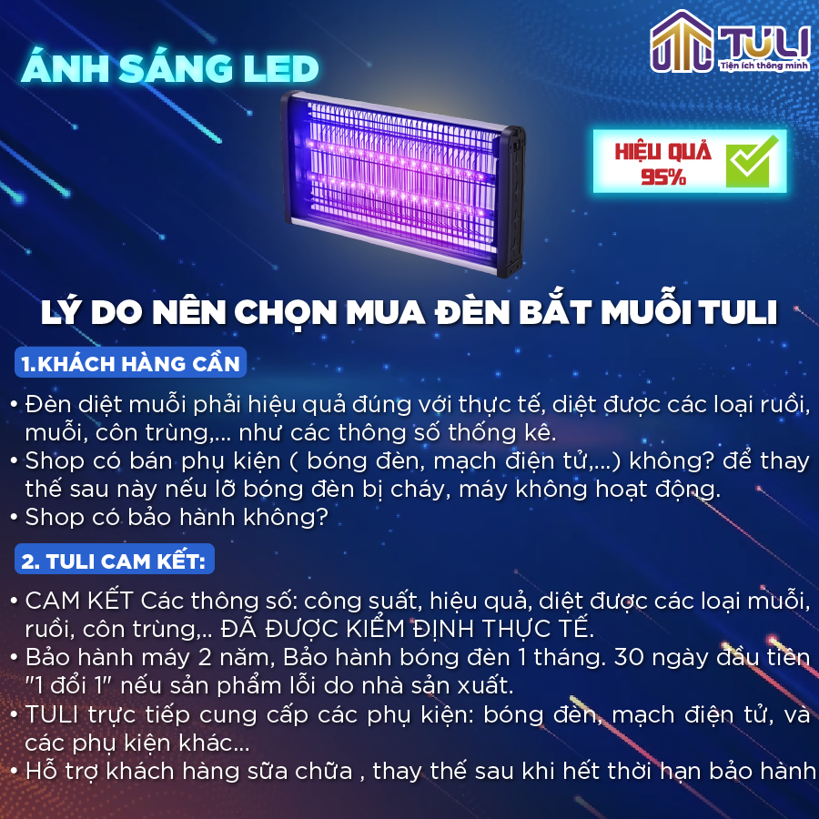Biết được bà con cần một biện pháp bảo vệ cũng như diệt muỗi, TULI đã nghiên cứu và cho ra mắt loại đèn thu hút và diệt muỗi tại nhà. Đi kèm những tính năng ưu việt: