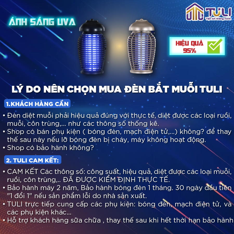 Biết được bà con cần một biện pháp bảo vệ cũng như diệt muỗi, TULI đã nghiên cứu và cho ra mắt loại đèn thu hút và diệt muỗi tại nhà. Đi kèm những tính năng ưu việt:
