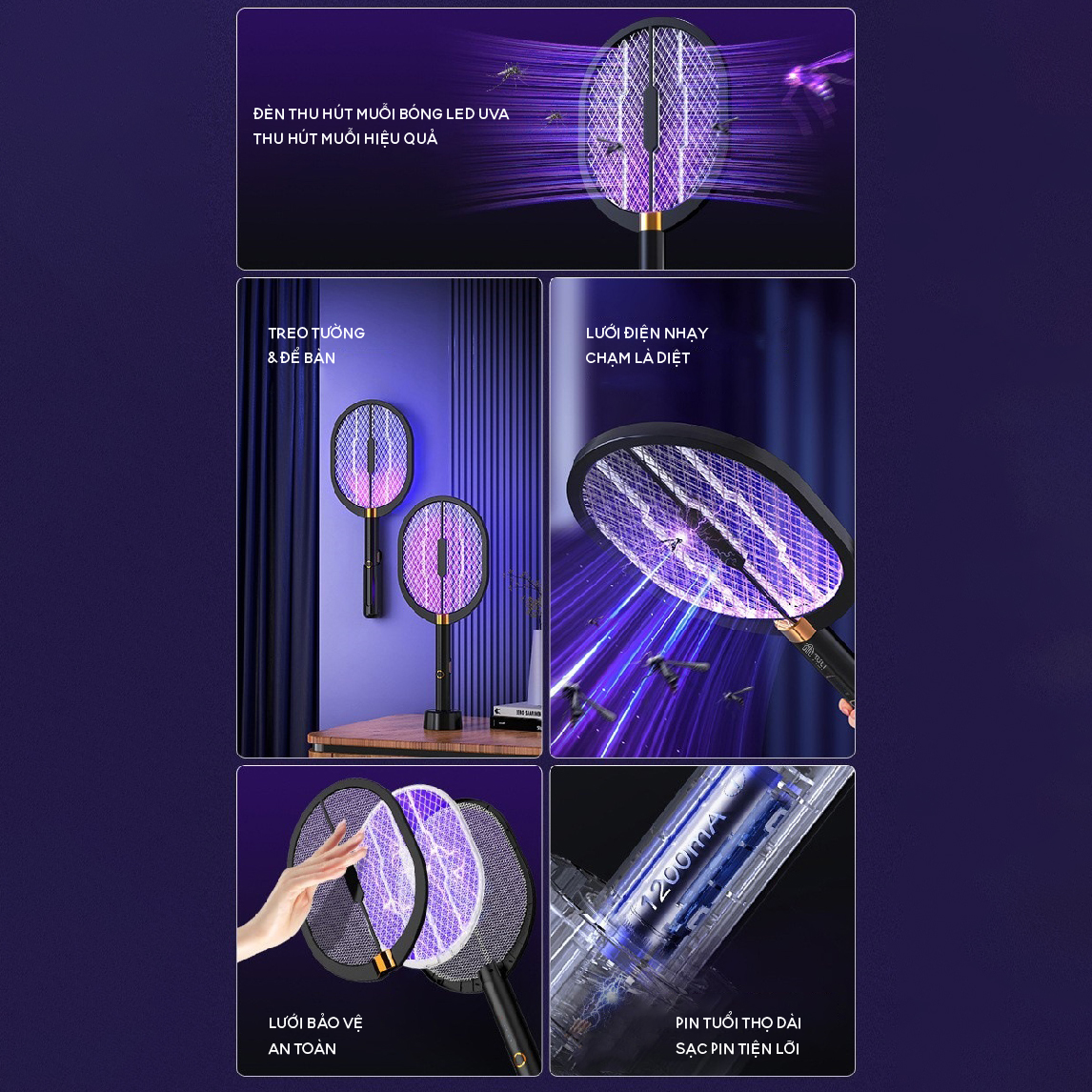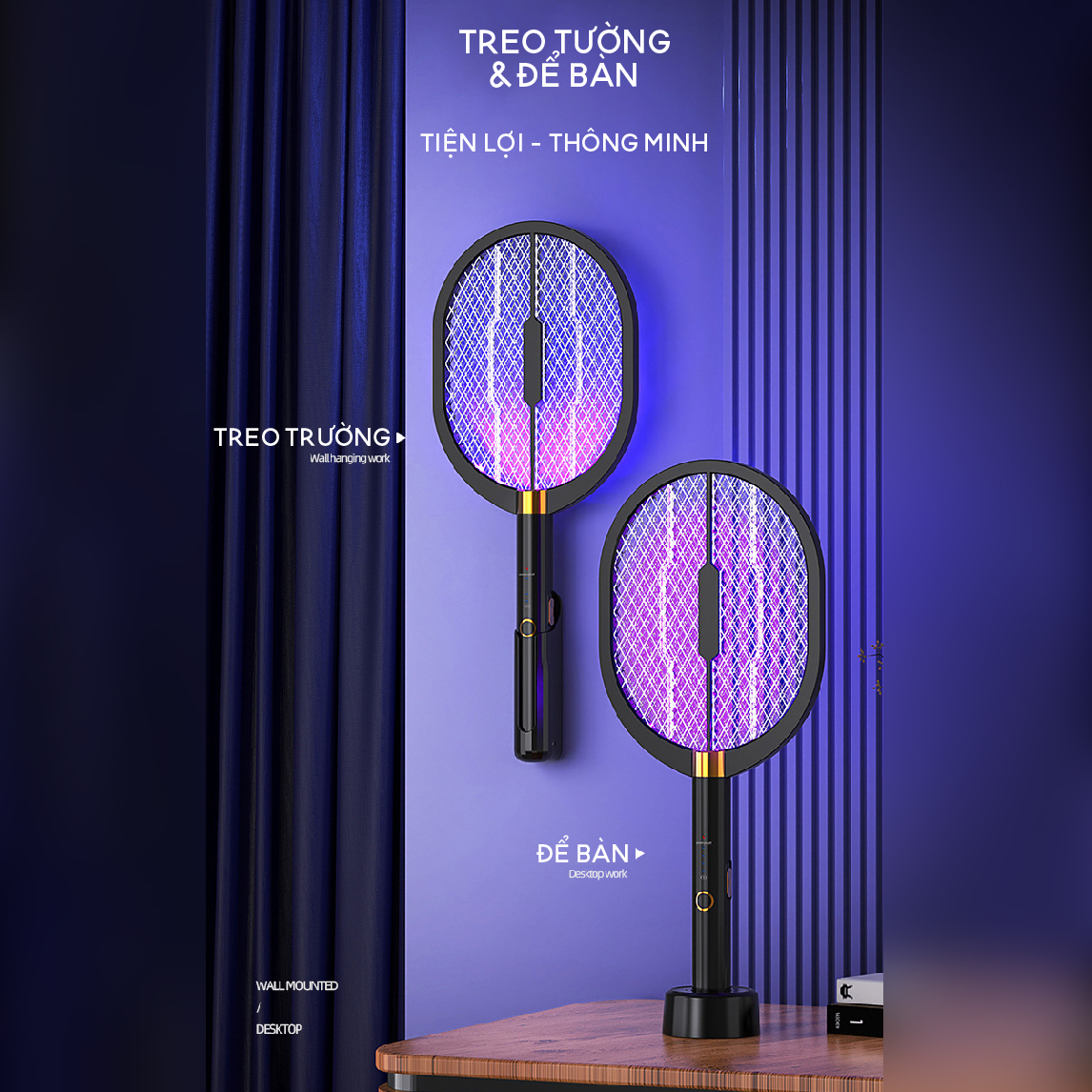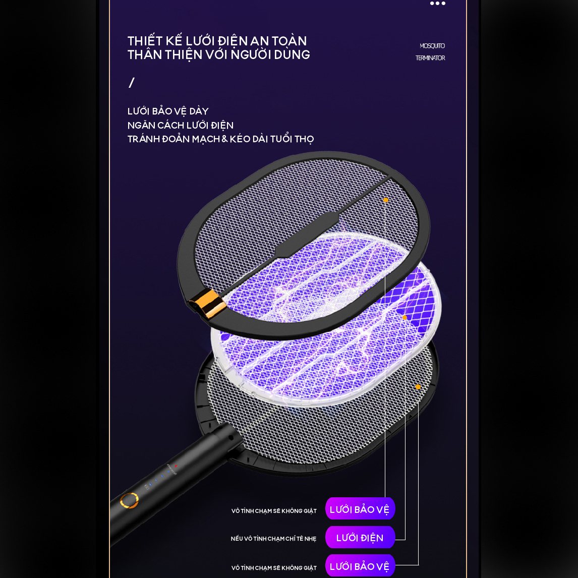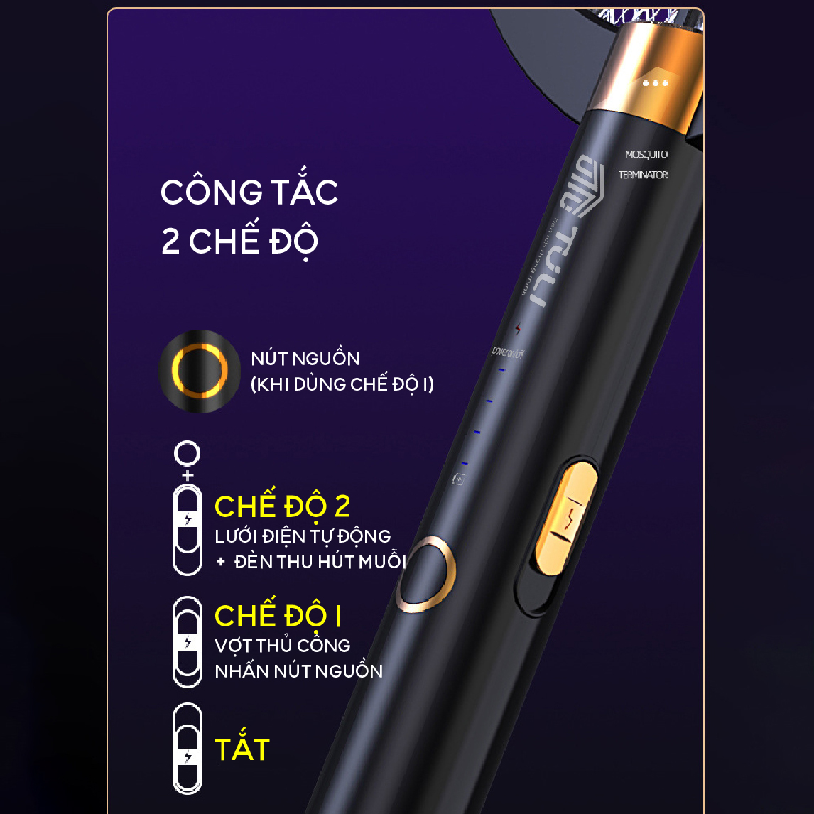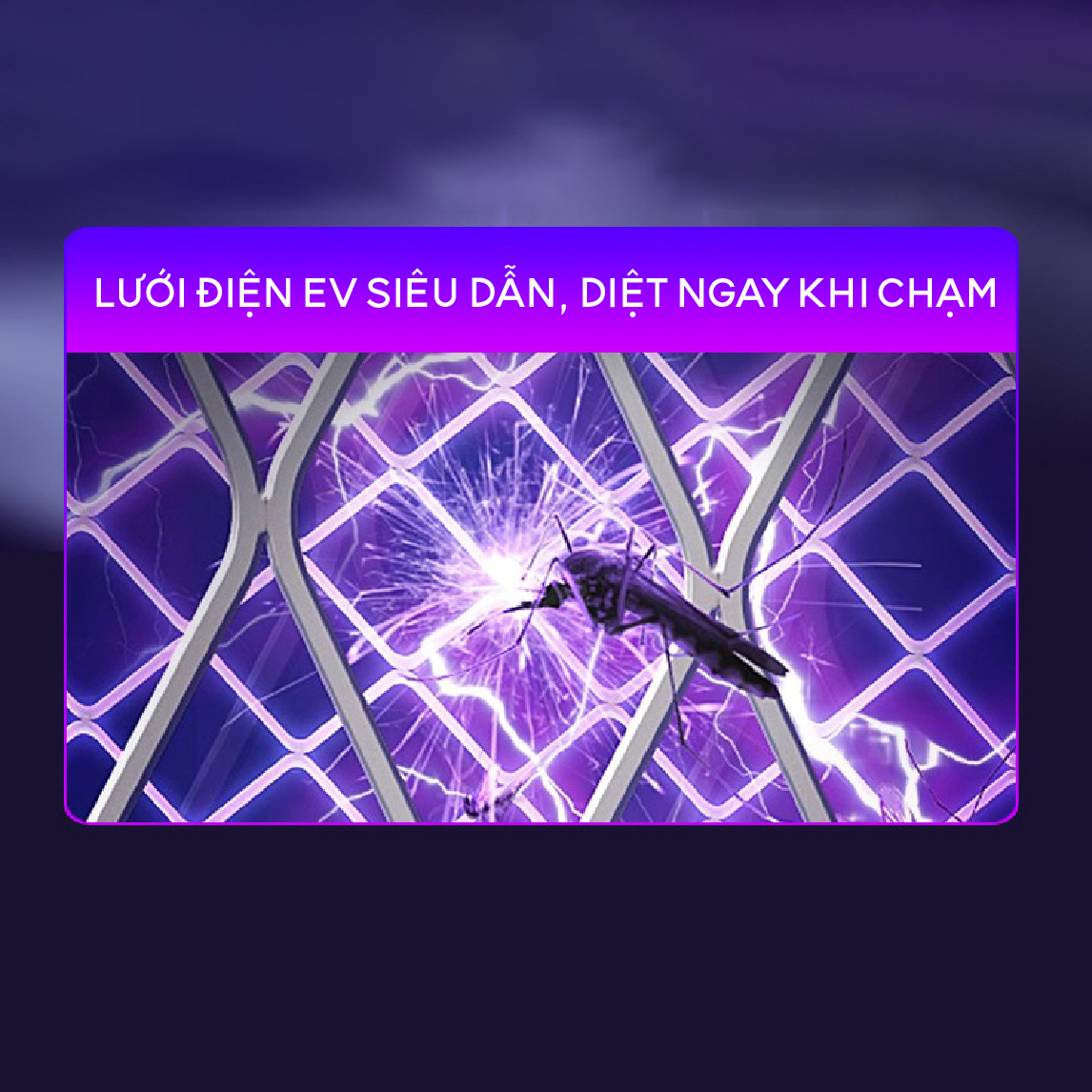 - Chế độ 2 (Công tắc mức 2): Lưới điện tự hoạt động không cần ấn nút, đi kèm ánh đèn tím dụ muỗi.