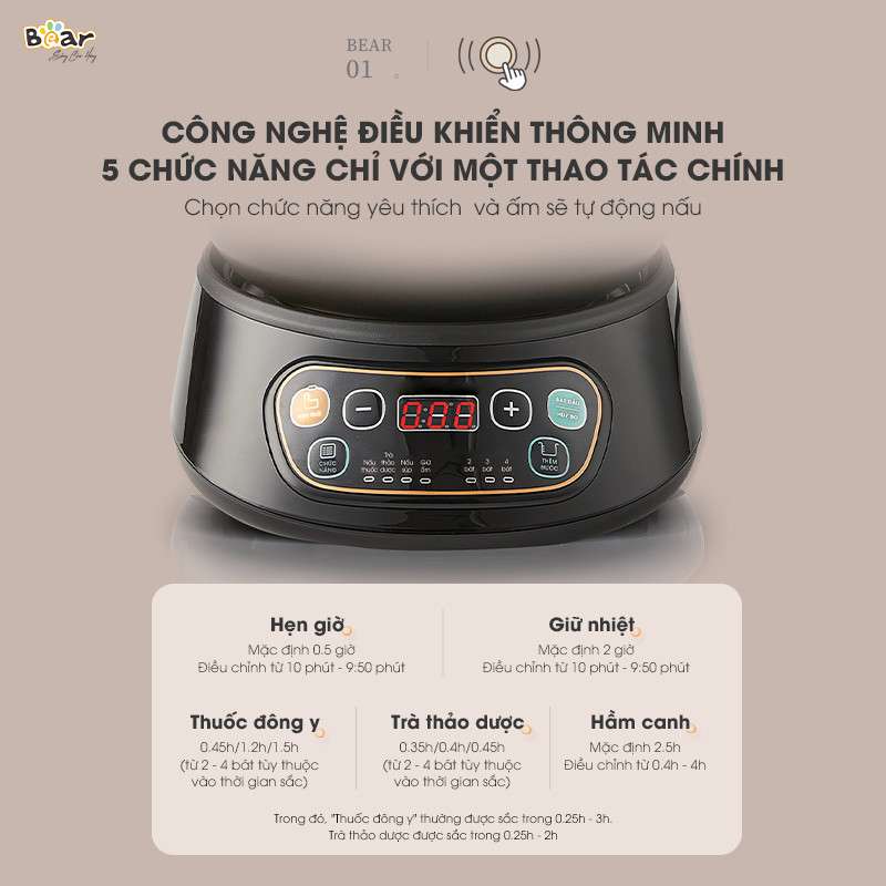 Ấm sắc thuốc Bear SB-AST35 sở hữu công nghệ điều khiển thông minh, tích hợp 5 chức năng khác nhau chỉ với một thao tác chính: