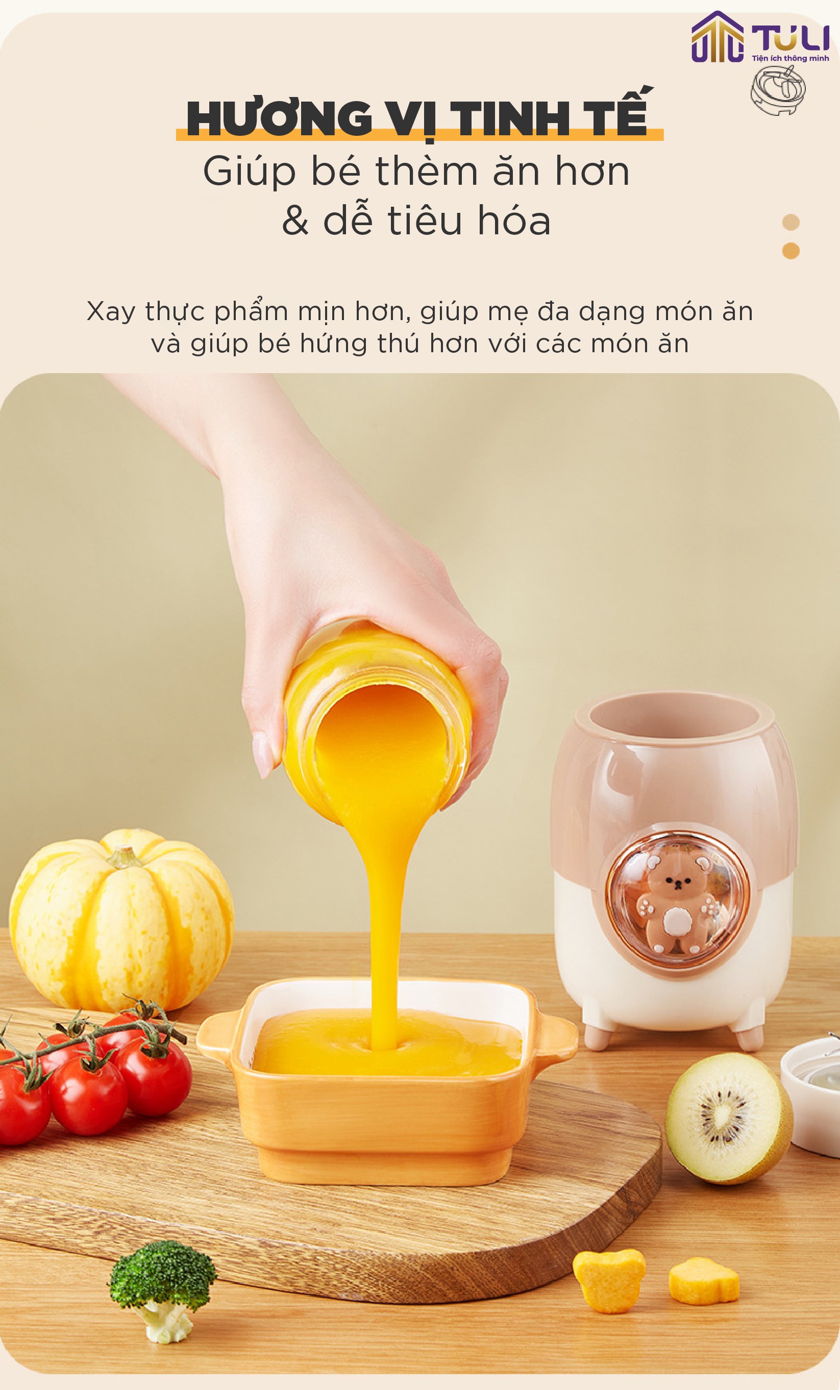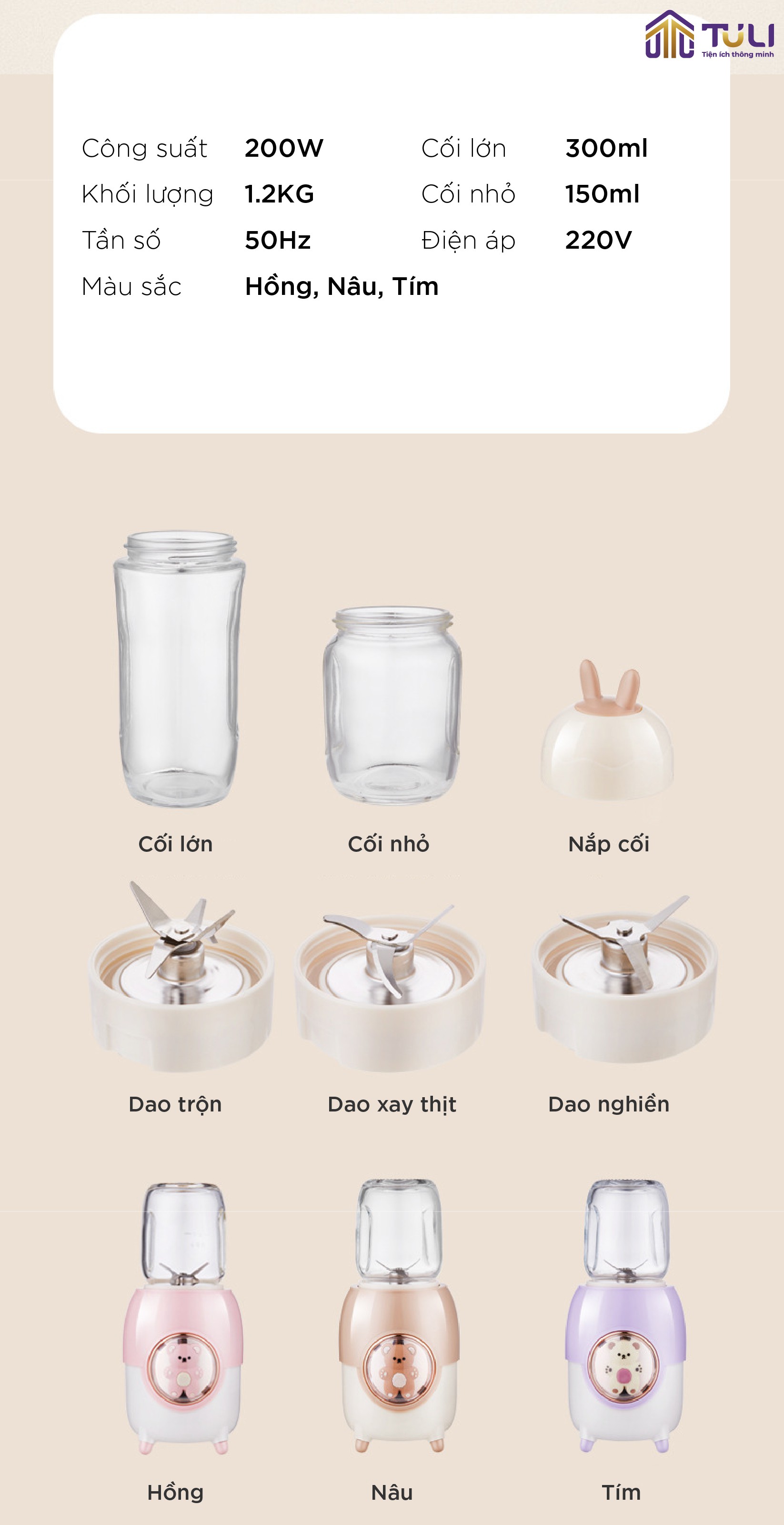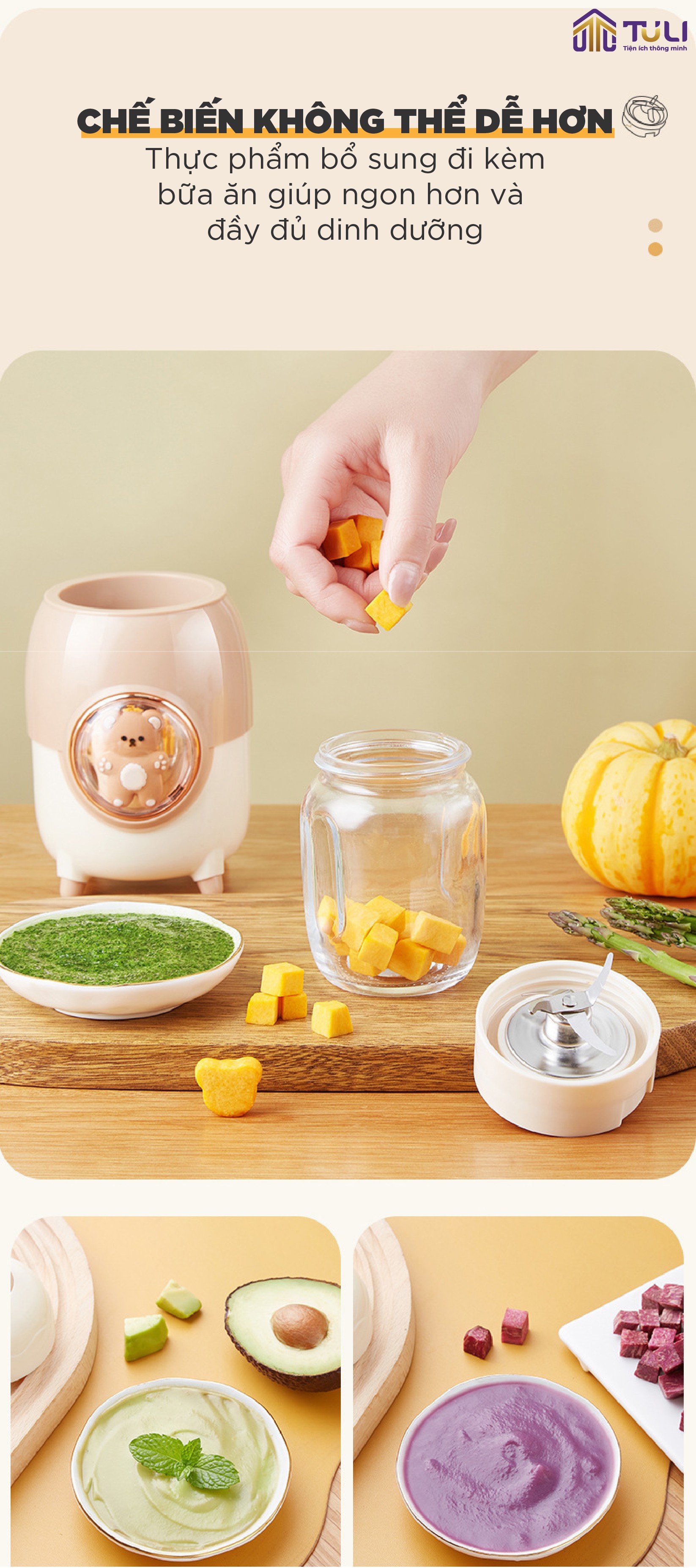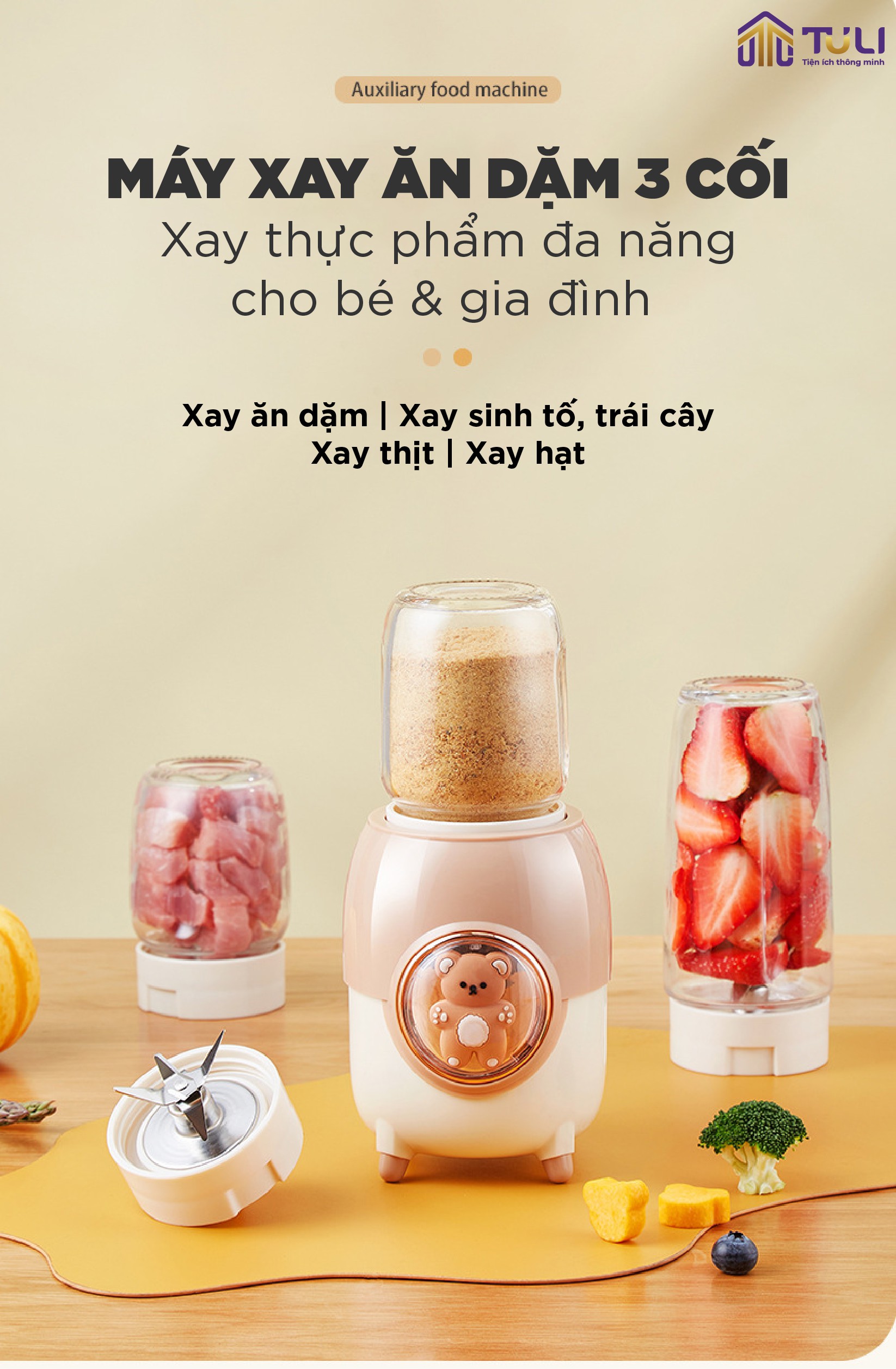Sở hữu thiết kế thông minh với 3 loại cối và lưỡi xay khác nhau, kết hợp với công suất 200W, máy xay ăn dặm 3 cối TULI TL-C04K1 là giải pháp tuyệt vời giúp các mẹ chế biến đa dạng các món ăn dặm thơm ngon, dinh dưỡng cho bé yêu.