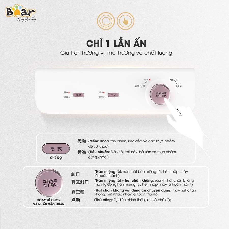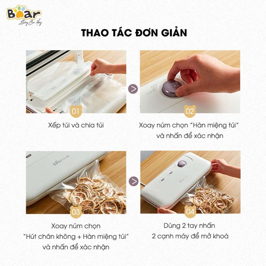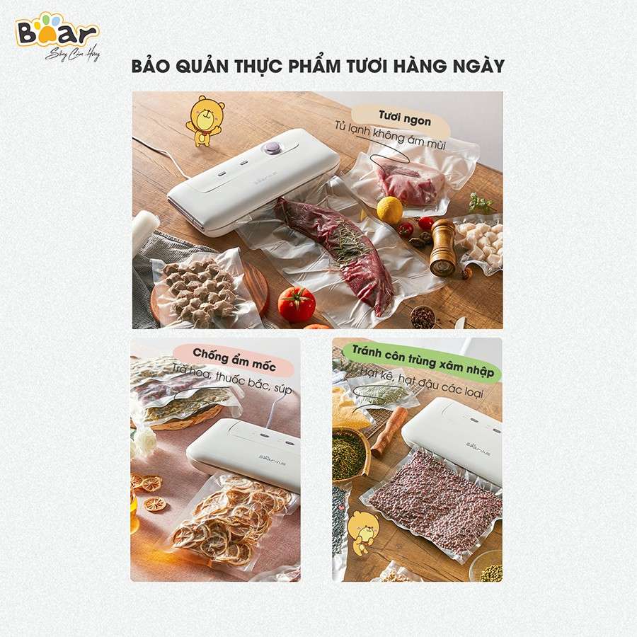 Máy hút chân không Bear B01V1 là thiết bị đa chức năng rất tiện lợi giúp bạn đóng gói và bảo quản thực phẩm tươi lâu hơn thông thường tới 3 lần. Những tính năng hấp dẫn dưới đây của sản phẩm sẽ chinh phục bạn.