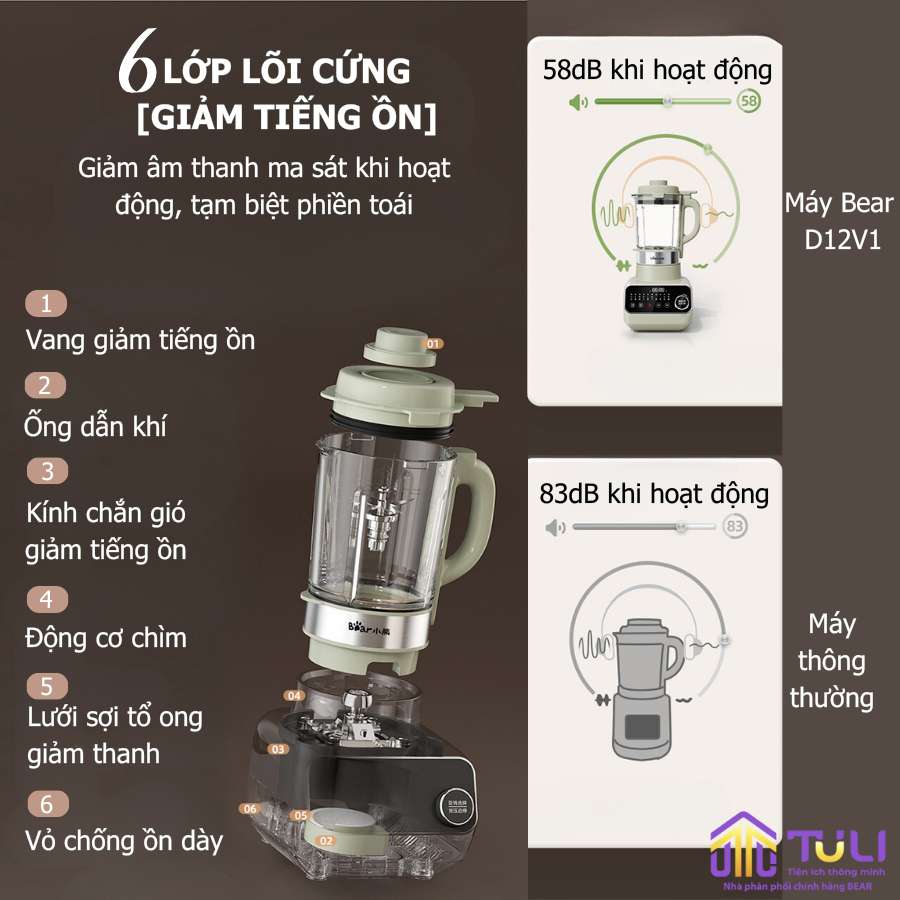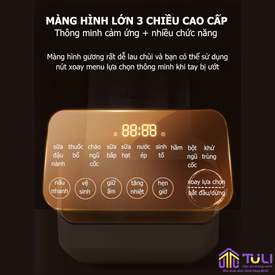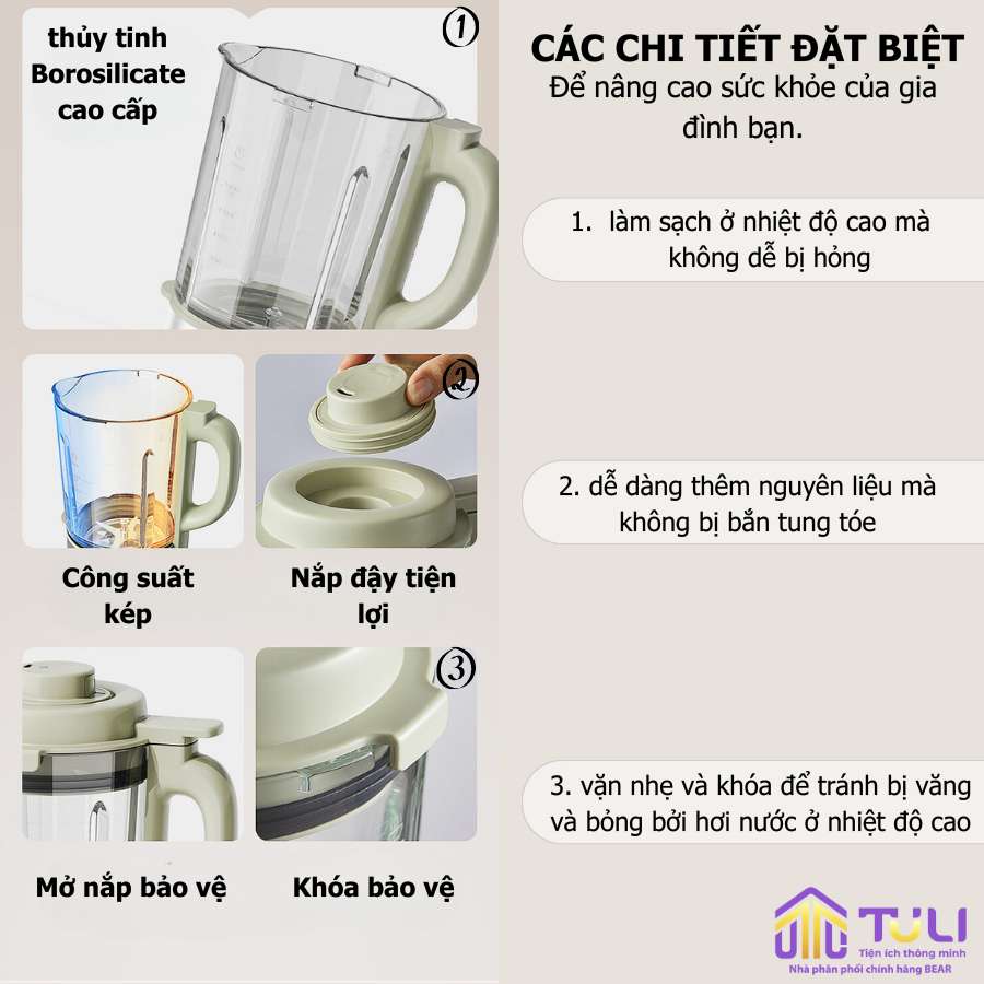 | Tính năng | Xay nấu nhiều loại thực phẩm dễ dàng với 10 tính năng chọn sẵn (sữa đậu nành, thuốc bổ, cháo ngũ cốc, sữa bắp, sữa hạt, nước ép, sinh tố, hầm, bột ngũ cốc, khử trùng), tiệt trùng ở nhiệt độ cao, dao tháo rời dễ dàng vệ sinh, giảm tiếng ồn gấp 6 lần |