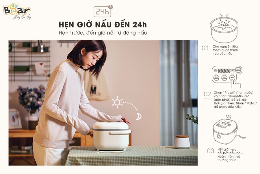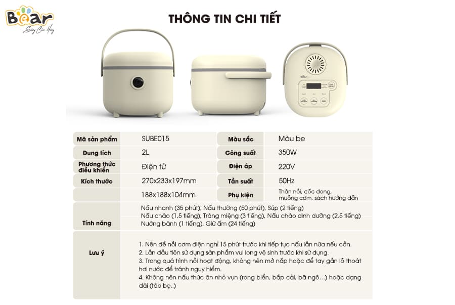Thông số kỹ thuật Nồi cơm điện thông minh 2L Bear B20A1