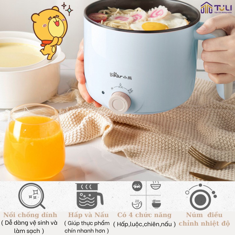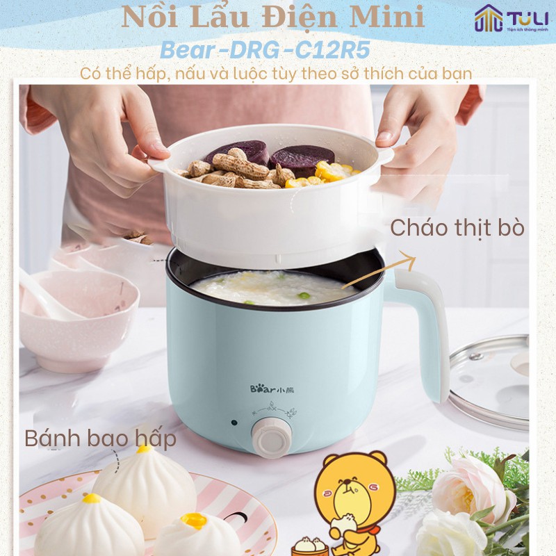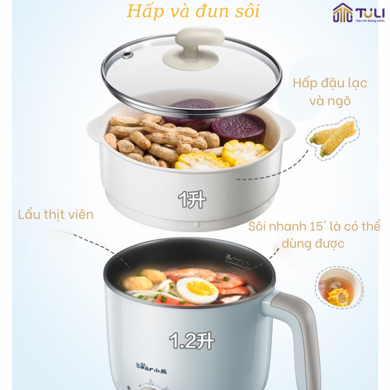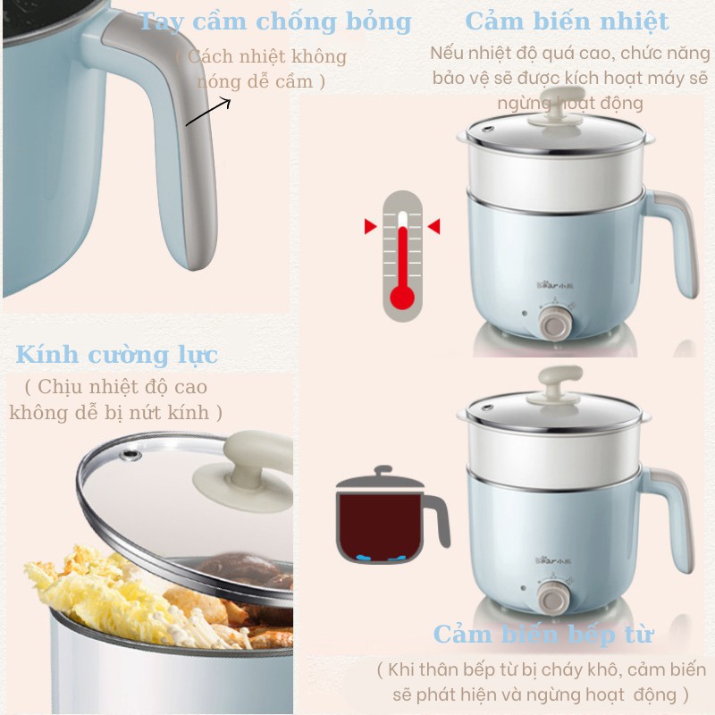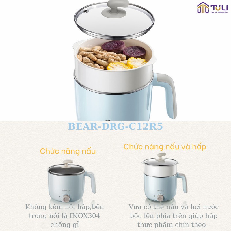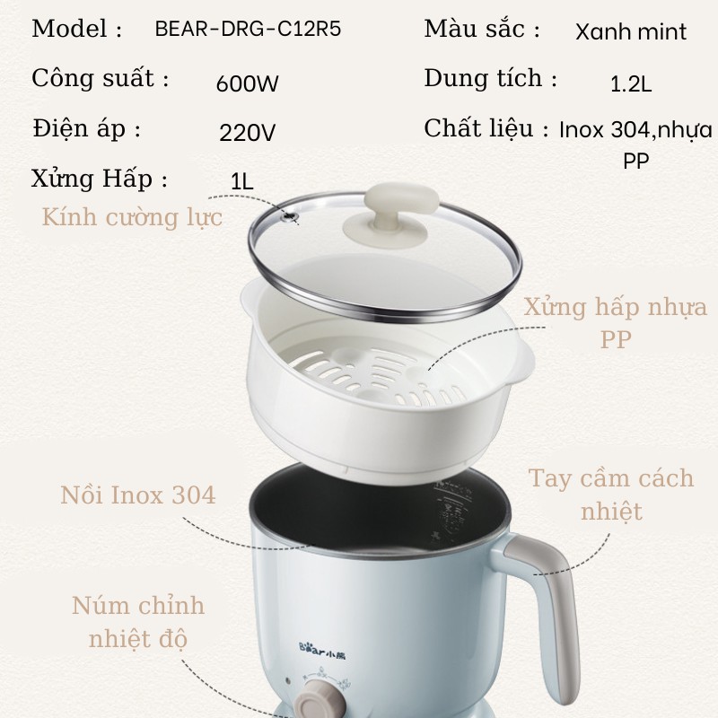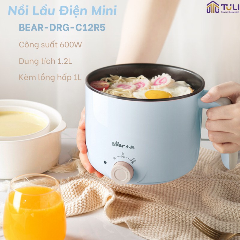 Ca nấu lẩu, mì, hâm, hấp, luộc cắm điện mini Bear DRG-C12R5 nhỏ gọn nhanh chóng thực hiện bữa ăn nhiều món ưa thích, lòng nồi chống dính dễ dàng vệ sinh lau rửa nút điều khiển vặn 2 mức công suất đơn giản