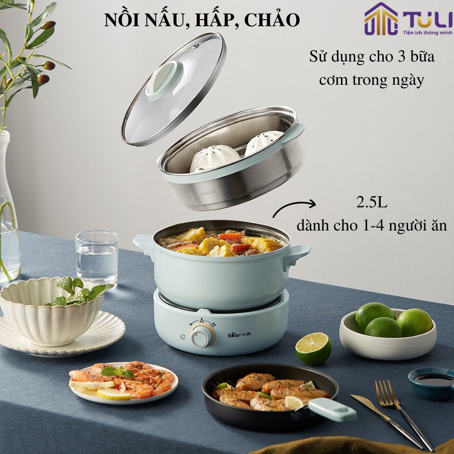 Mang lại sự đa dạng cho những bữa ăn của gia đình bạn, Nồi điện đa năng 4 chi tiết kèm chảo Bear DHG-B25B2 với thiết kế 3 tầng có thể thực hiện các chức năng như hấp, chiên, xào, luộc, hầm, rán. Sở hữu thiết kế tách rời, phần nồi nấu có xoay đa hướng, còn có thể di dời bếp đi nơi khác khi thức ăn đã chính, giúp cho không gian bàn ăn trở nên rộng rãi hơn.