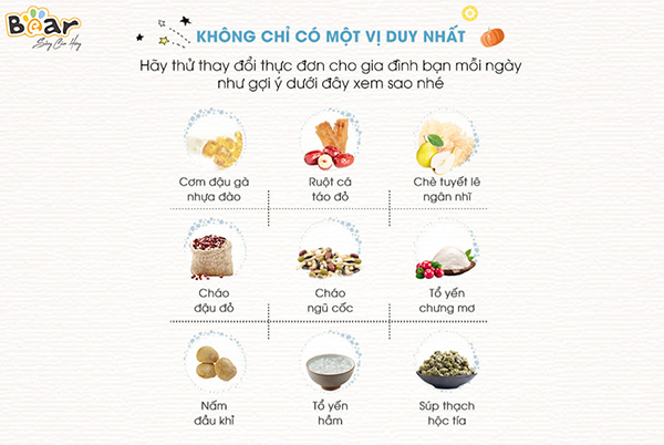 Bạn đang có nhu cầu cải thiện bữa ăn gia đình cả về số lượng lẫn chất lượng? Bạn cũng muốn chuẩn bị cho bé yêu những bữa cháo ăn dặm giàu chất dinh dưỡng. Nồi nấu chậm Bear 2.5L SUBE003 tích hợp tới 8 chức năng nấu, hấp, hầm cùng nhiều tính năng khác chính là sự lựa chọn tuyệt vời của gia đình bạn.
